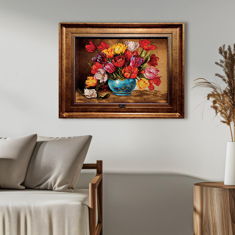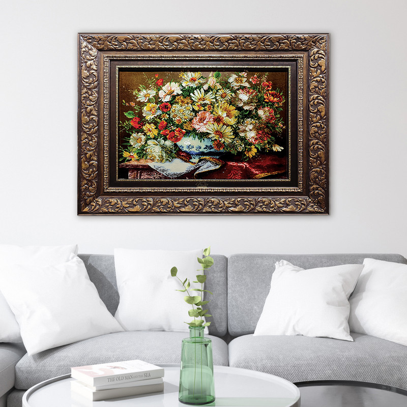 تابلو فرش دستبافت فرش رضا ترکمنی طرح گل و گلدان مدل 97