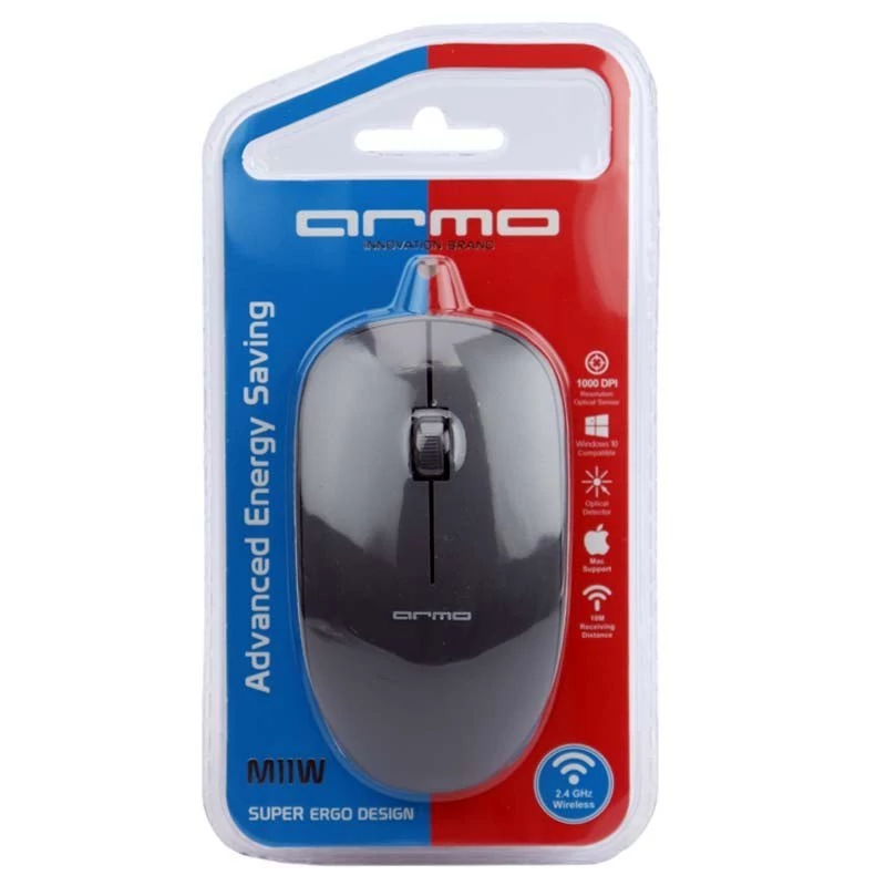 موس Armo M11W با قابلیت اتصال به صورت بیسیم به سیستم شما، این امکان را فراهم می آورد تا به راحتی از آن استفاده نمائید. این موس با ابعاد 106x57x28 میلیمتر و وزن کم 42٫5 گرم به همراه طراحی ارگونومیک باعث شده تا در صورت استفاده طولانی مدت از این موس، نگران خستگی دست هایتان نباشید. جنس بدنه ی ماوس بی سیم آرمو مدل M11W از پلاستیک ABS بوده که در برابر ضربه مقاوم بوده و شما به راحتی می توانید آن را حمل کنید و در جا به جا شدن نگران آسیب دیدن این موس نباشید. موس سبک Armo M11W دارای 3 کلید کاربردی می باشد و با استفاده از دو باتری سایز AAA تغذیه می شود، که به راحتی می توانید آن را جدا کنید و مجددا خریداری و نصب کنید. میزان دقت این محصول DPI 1000 می باشد و تا فاصله 10 متری از سیستم شما نیز به کار خود ادامه داده و با اتصال 2٫4 گیگاهرتزی با گیرنده خود باعث می شود تا کوچکترین فرکانسی از بین نرود. برای نصب این موس به سیستم خود، نیازی به نرم افزار خاصی ندارید و تنها با نصب دانگل USB به سیستم خود می توانید به راحتی از آن استفاده نمائید. این موس بیسیم با سیستم عامل های Windows Vista، 7، 8، 10 سازگاری دارد.