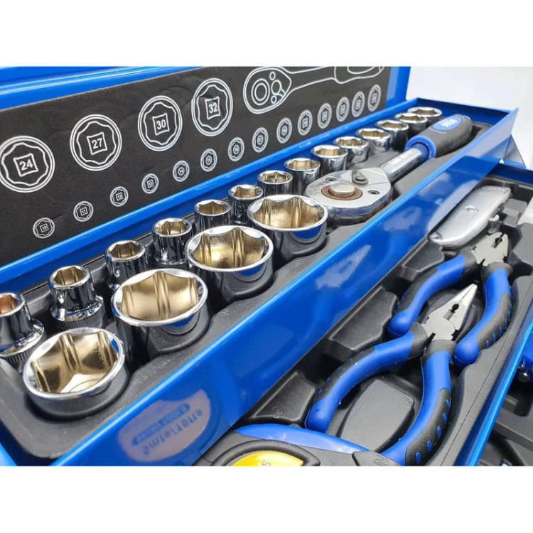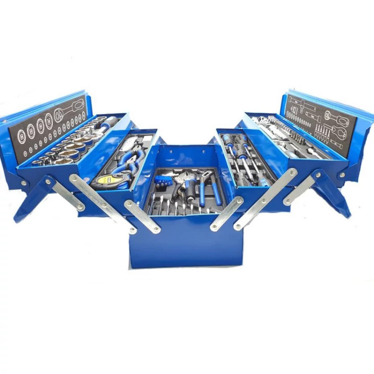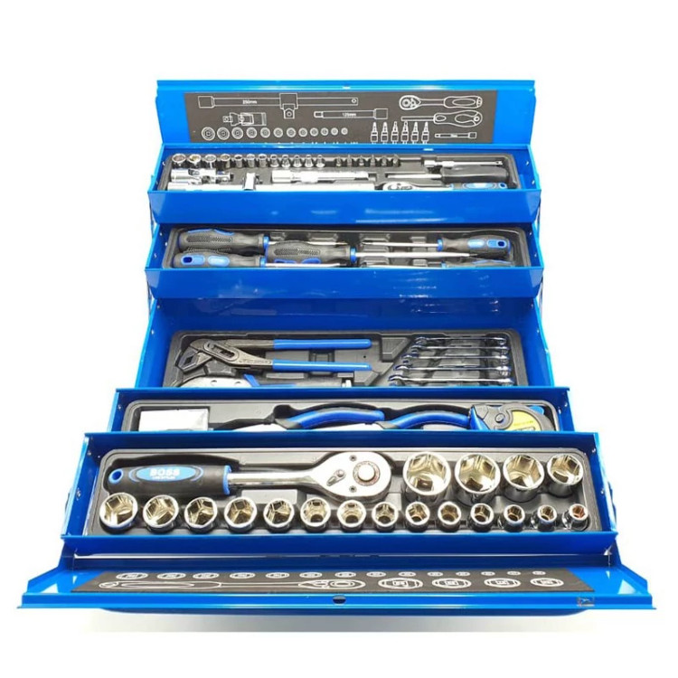 این مجموعه 85 پارچه بسیار نفیس و باکیفیت از برند خوشنام BOSS، از تولیدات درجه یک کشور چین است که به همراه یک جعبه ابزار فلزی مستحکم و مقاوم عرضه میشود. این محصول برخلاف جعبههای پلاستیکی یا کیفهای پارچهای عرضهشده برای بسیاری از مجموعههای ابزار، دارای عمری طولانی بوده و سالیان سال میتوانید ابزارهای خود را در این جعبه قرار دهید. این جعبه دارای سه طبقه بوده و با مکانیزم پلکانی از وسط باز میشود. دستههای دوگانه این جعبه نیز از فلز ساخته شده است. این مجموعه از لحاظ تنوع گونه شامل 4 قسمت اصلی است؛ قسمت اول که مهمترین بخش این جعبه را نیز تشکیل میدهد، مجموعه آچار باکس یا اگر بخواهیم صحیحتر بگوییم، Socket Set است. این مجموعه که مطابق با استاندارد متریک است، دارای 20 سری است که همگی از دهانه 1/2 اینچی استفاده میکنند. این سوکتها با اندازههای 10 ،11 ،12 ،13 ،14 ،15 ،16 ،17 ،18 ،19 ،20 ،21 ،22 ،23 ،24 ،27 ،30 ،34 و 36 میلیمتر در اختیار کاربر قرار میگیرند. یک عدد آچار جغجغه 1/2 اینچی با دسته فولادی لاستیکی نیز وظیفه چرخاندن این سوکتها را به عهده دارد. دو عدد اضافه کننده طولی نیز یکی به طول 120میلیمتر و دیگری 250 میلیمتر به همراه یک لق لقه 1/2 اینچی متحرک و یک لق لقه 1/2 اینچی ثابت امکان باز کردن و بستن پیچها را در تنگترین و دور از دسترسترین حالات، امکانپذیر میسازند. قسمت دیگر این مجموعه نیز شامل یک دست آچار، یک سر تخت و یک سر رینگ است. این مجموعه 10 تایی هم مطابق با استاندارد متریک بوده و شامل سایزهای 6، 7، 8، 9، 10، 11، 12، 13، 14، 15، 16 میلیمتر است. قسمت بعدی شامل 5 عدد پیچگوشتی بسیار باکیفیت است؛ سه عدد پیچ گوشتی دوسو و دو عدد پیچ گوشتی چهارسو. سایر ابزارها شامل انبردست، دم باریک، انبر قفلی و بسیاری دیگر از ابزار آلات که در تصویر مشاهده میکنید، است.