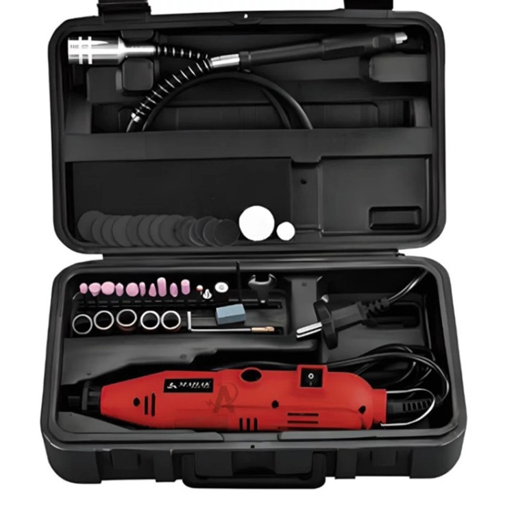 این دستگاه دارای شیلنگ خرطومی و همچنین یک کیت ابزار 45 قطعه میباشد. که به راحتی کارهای سوراخ کاری، فرز کاری، برش، پرداخت، سنگ زنی، سنباده زنی و حکاکی قطعات کوچک را انجام میدهد. همچنین در کنار این محصول یک استند جهت آویزان نگه داشتن دستگاه وجود دارد. شیلنگ خرطومی نیز جهت کارهای طریف تر و دقیق تر در بسته بندی موجود می باشد.