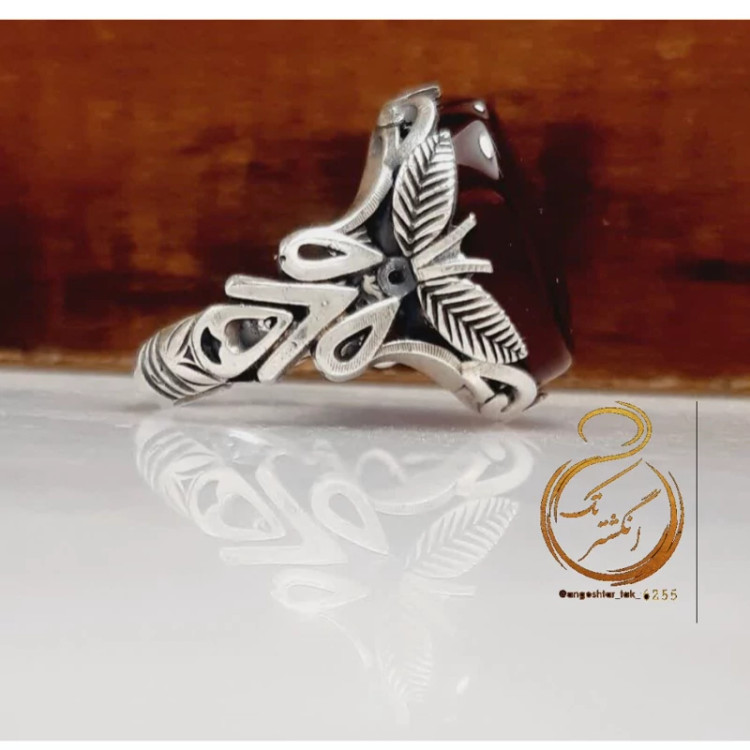 انگشتر نقره مردانه عیار ۹۲۵شبکه کاری شده مدل شاپرک نگین عقیق سرخ خراسانی کبدی بسیار زیبا و فاخر و خوش دست.