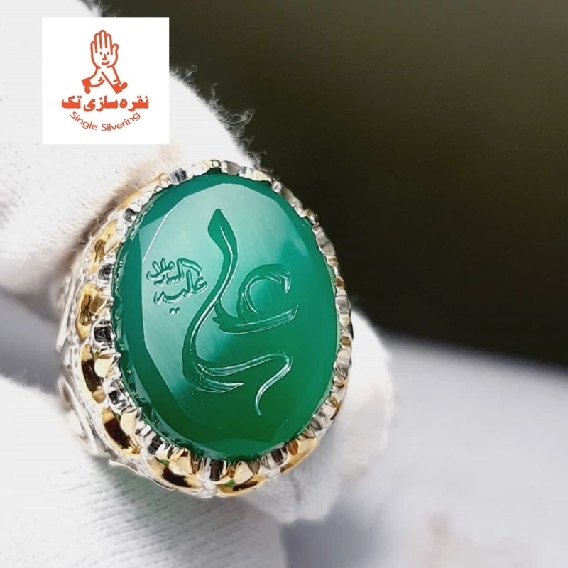 انگشتر دستساز نقره تاج طلایی رنگ ثابت مردانه مدل پولکی عیار 925 نگین عقیق سبز با حکاکی دستی بسیار زیبای یا علی .
