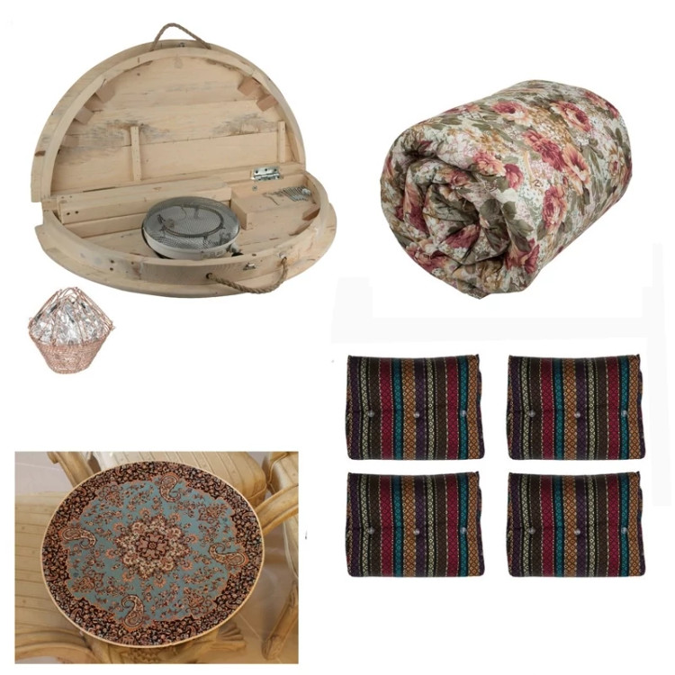 ست کرسی گرد تاشو پارسین شامل 9 تکه است که یک عدد کرسی چوبی تاشو 90 سانتی، یک عدد لحاف کرسی لایکو 4 متری، یک عدد ترمه تولید یزد، یک هیتر برقی و یک عدد هیتر ذغالی است.