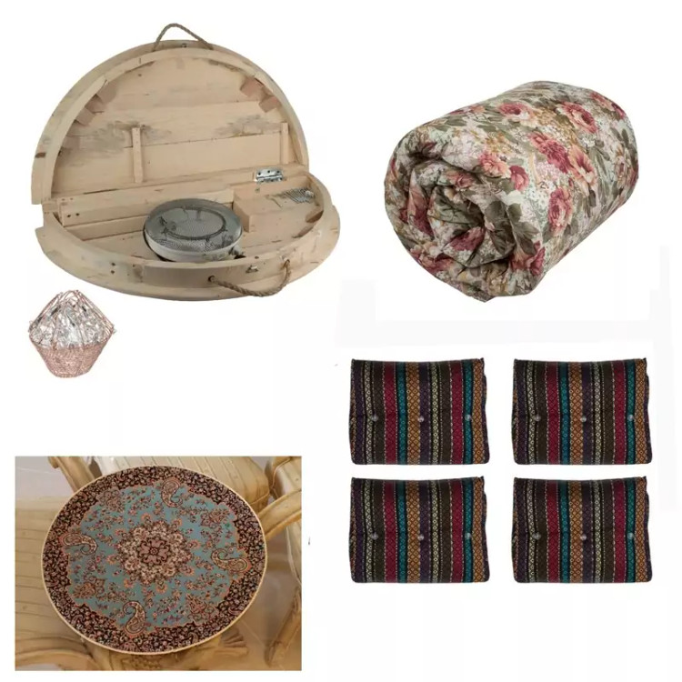 ست کرسی گرد تاشو پارسین شامل 9 تکه است که یک عدد کرسی چوبی تاشو 90 سانتی، یک عدد لحاف کرسی لایکو 3 متری، یک عدد ترمه تولید یزد، یک هیتر برقی و یک عدد هیتر ذغالی است.