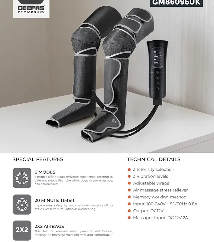 ماساژ هوا، تسکیندهنده استرس: ماساژ فشردهسازی هوای قدرتمند، استرس را تسکین میدهد، خستگی پا را کاهش میدهد و گردش خون را افزایش میدهد و آن را برای ورزشکاران، سالمندان و هر کسی که ناراحتی پا دارد، ایدهآل میکند.