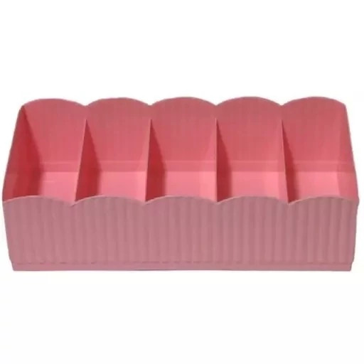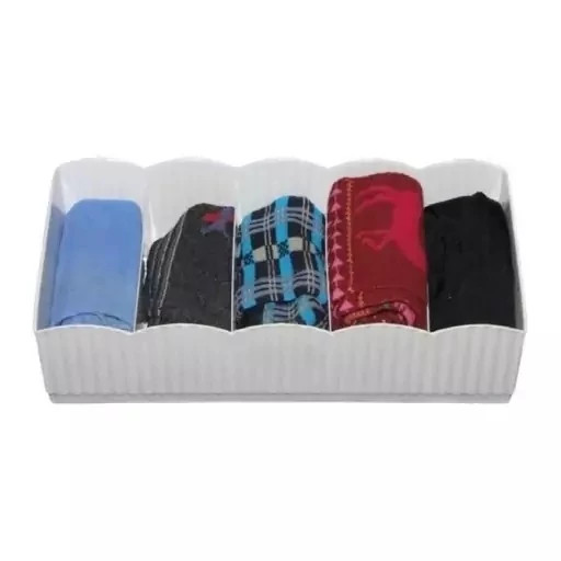 مقسم کشو پنج محفظه پهن ساخته شده از جنس پلی پروپیلن بوده که مناسب براى نظم دادن جوراب، لباس زیر، لوازم آرایش و غیره می باشد و فضای داخل کشو را مرتب می کند. این محصول دارای پنج محفظه بوده و وزن آن سبک می باشد. این باکس مناسب برای کشو های آشپزخانه، اتاق کار، اتاق بچه، اتاق خواب و غیره بوده و قابل شستشو نیز می باشد. از این باکس ها می توان برای کاشت پنج گل کوچک در کنار هم یا ریختن پنج تنقلات در کنار هم استفاده نمود. این محصول نسبت به مدل مشابه آن مقداری پهن تر می باشد.