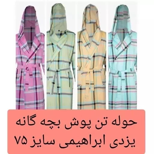 حوله تنپوش ابراهیمی یزد مدل کودک ( بچه گانه) سایز 75 قد حوله از سرشانه تا زیر زانو 75 سانتیمتر است