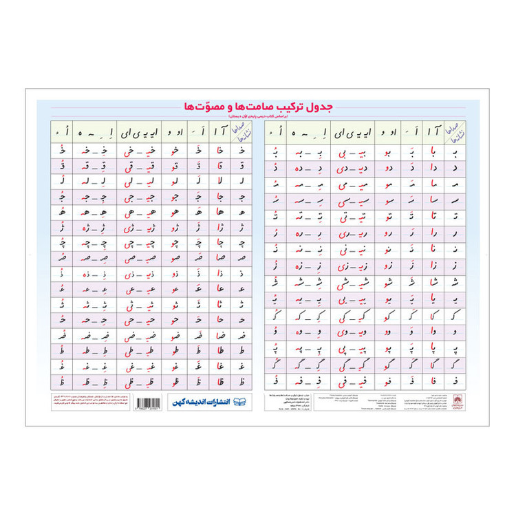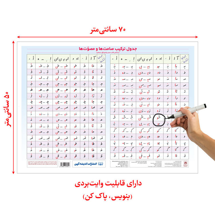 سایر توضیحات: بر اساس کتاب درسی پایه اول دبستان. یک پوستر آموزشی جدول ترکیب صامتها و مصوتها در اندازه 70×50 سانتی متر، دارای جعبه اختصاصی همراه با ضربه گیر داخلی، دارای قابلیت وایت بردی، دارای یک لایه روکش سلفون براق