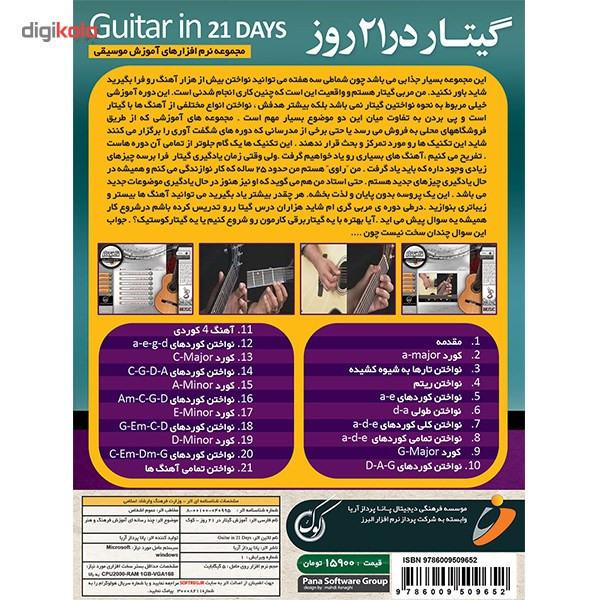 «نرم افزار آموزش گیتار کلاسیک در ۲۱ روز» مجموعهی جذاب و کارآمدی است که طی سه هفته نواختن تعداد زیادی آهنگ را به شما میآموزد. هدف آموزشی این مجموعه نواختن انواع مختلفی از آهنگها با گیتار است و با درسهایی که در اختیار هنرآموزان میگذارد به آنها میآموزد که چطور با همین ۲۱ درس بتوانند گیتارشان را دست بگیرند و آهنگهای دلنشینی بنوازند که شاید از راههای دیگر نتوان به این سرعت به آن تکنیکها دست یافت. ۲۱ درس این مجموعه بهترتیب شامل: مقدمه، کورد a-major، نواختن تارها به شیوه کشده، نواختن ریتم، نواختن رکوردهای a-e، نواختن طولی d-a، نواختن کلی کوردهای a-d-e، نواختن تمامی کوردهای a-d-e، کورد g-major، نواختن کوردهای d-a-g، آهنگ ۴ کوردی، نواختن کوردهای a-e-g-d، کورد C-major، نواختن کوردهای c-g-d-a، کورد a-minor، نواختن کوردهای am-c-g-d، کورد e-minor، نواختن وردهای G-Em-C-D، کورد d-minor، نواختن کوردهای c-em-dm-g و نواختن تمامی آهنگها. تمامی افراد علاقهمند به فراگیری نواختن آهنگ با گیتار میتوانند از فیلمهای آموزشی این مجموعه بهره ببرند. «موسسه فرهنگی دیجیتال پانا پرداز آریا» این مجموعه را برای هنرآموزان منتشر کرده است.
