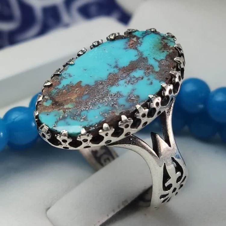 انگشتر نقره مردانه، با نگین فیروزه نیشابوری