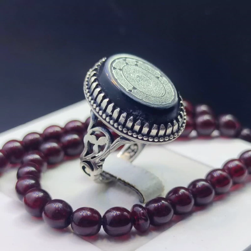 انگشتر نقره مردانه عقیق مشکی منقش به 18 تا ذکر --