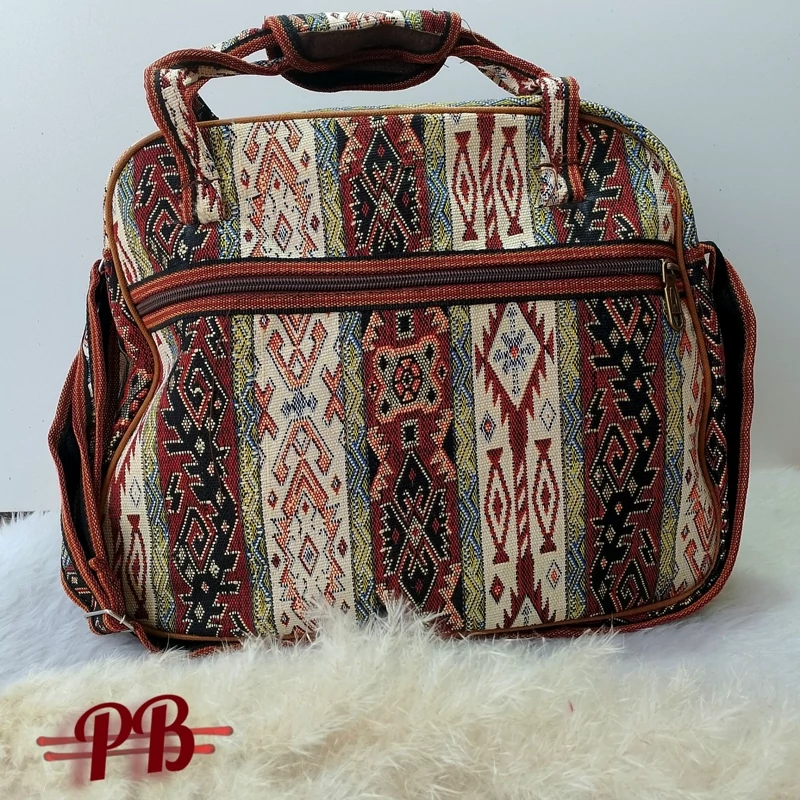ساک مسافرتی جاجیمی دارای یه زیپ اصلی و یک جیب زیپ خور در جلوی