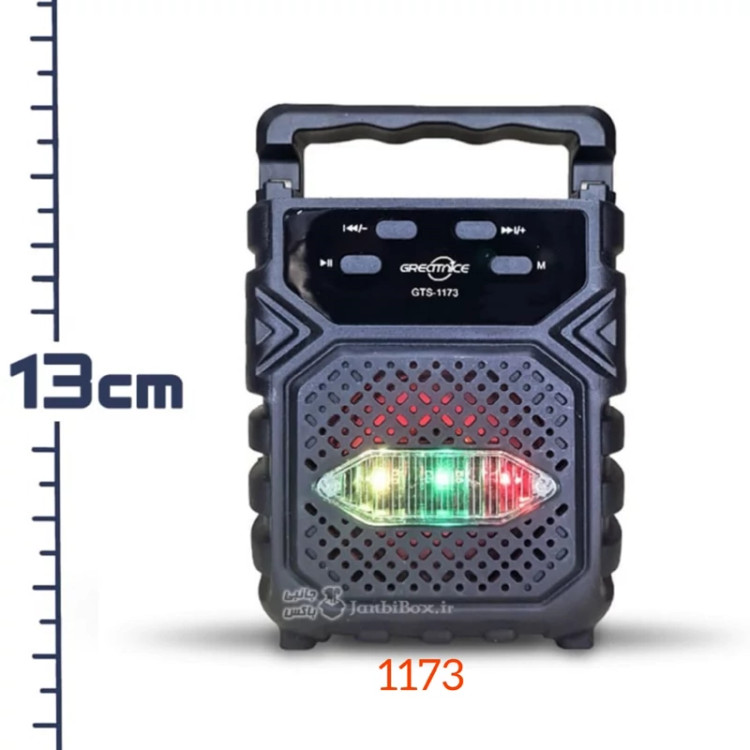 اسپیکر پرتابلgts1173 را می توان به شکل ایستاده به کار برد و علاوه بر بلوتوث، با کارت حافظه، فلش مموری سازگاری دارد ،وجود دو رقص نوررنگی در هنگام پخش موزیک، باتری 800 میلی آمپر ساعتی می باشد