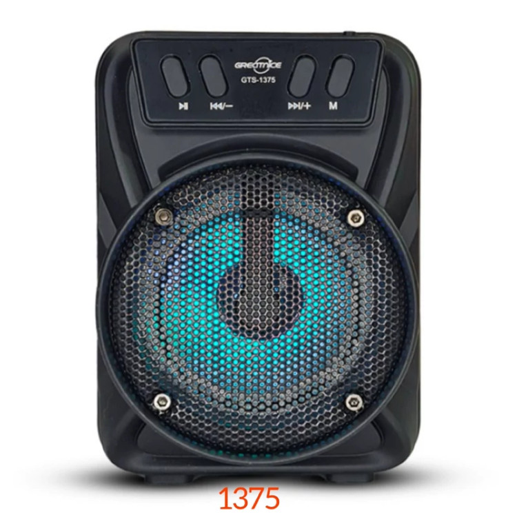 اسپیکر بلوتوثی Gts-1375 را می توان به شکل ایستاده به کار برد و علاوه بر بلوتوث، با کارت حافظه، فلش مموری سازگاری دارد، وجود رقص نوررنگی در هنگام پخش موزیک، باتری 1000 میلی آمپر ساعت