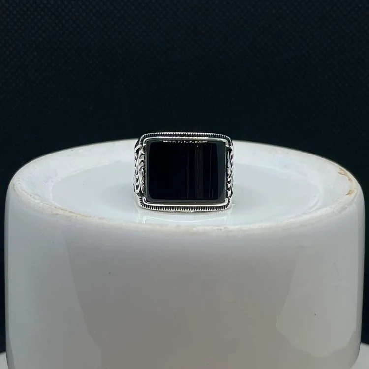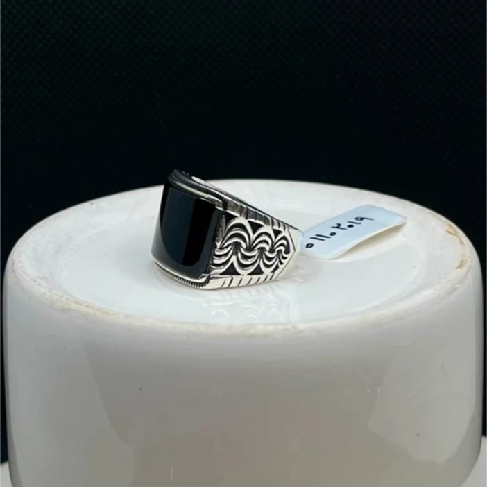 انگشتر نقره مردانه عقیق مشکی منحنی . این محصول دارای آبکاری رودیوم و سیاه قلم میباشد میباشد.