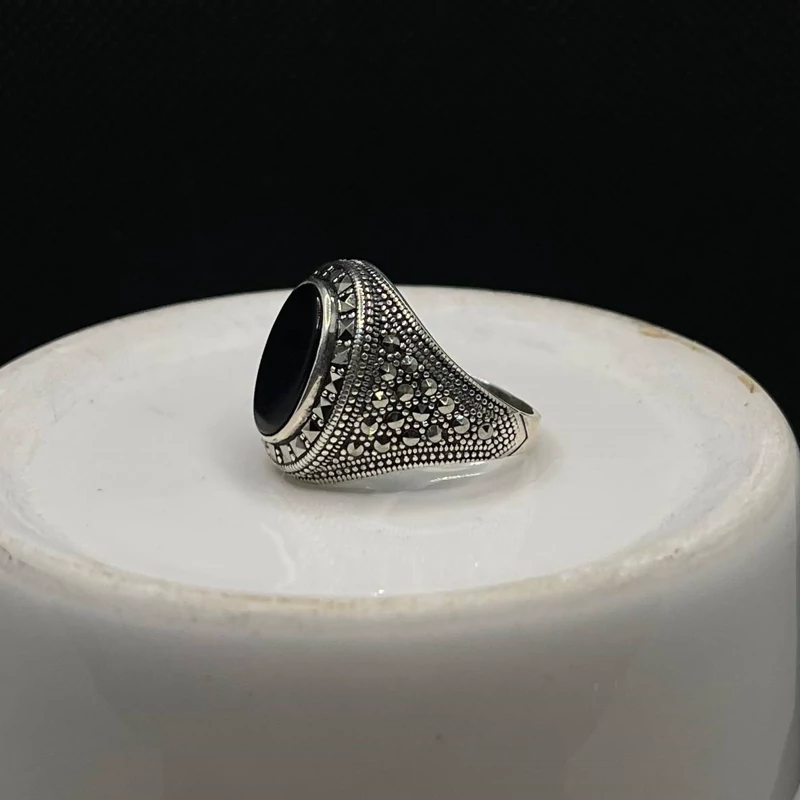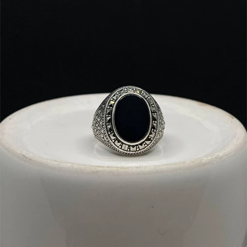 انگشتر نقره مردانه عقیق مشکی بیضی دور نگین مارکازیت. این محصول دارای سیاه قلم میباشد.