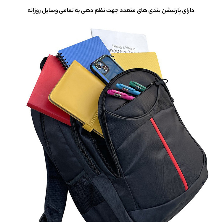 دارای یک محفظه اصلی همراه با پارتیشن بندی داخلی جهت حمل وسایل اصلی روزانه دارای دو جیب میانی جهت قرار دادن وسایل روزانه دارای دو جیب در سمت راست و چپ کوله جهت قرار دادن وسایل و یا بطری نوشیدنی