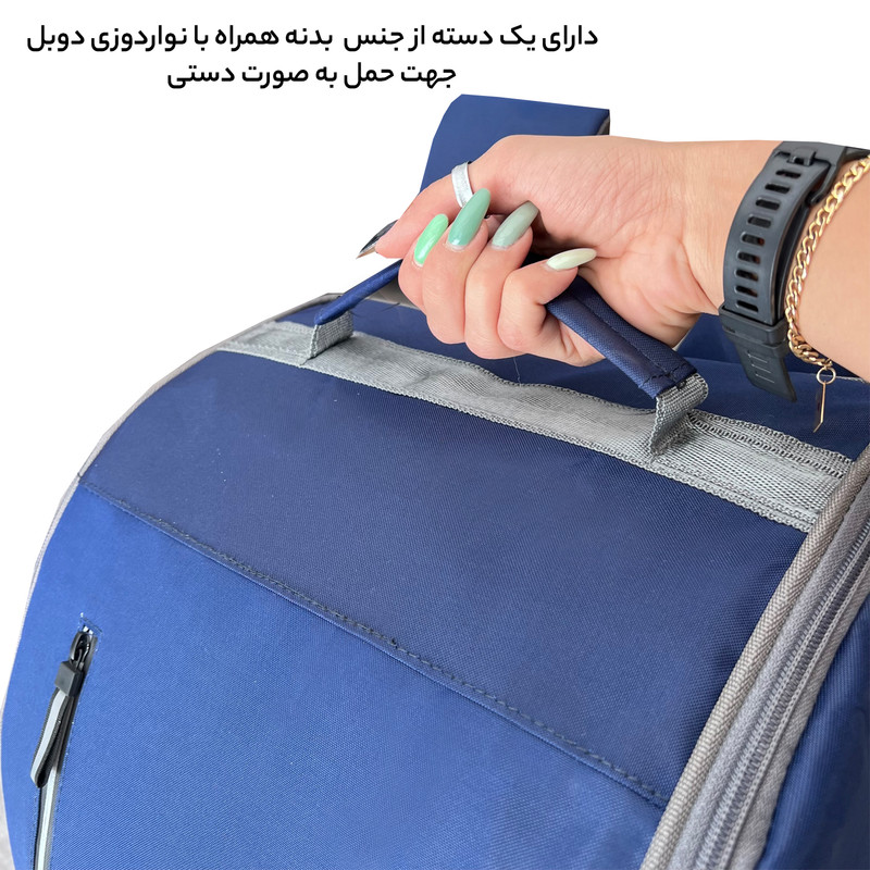 دارای یک دسته از جنس نوار جهت حمل به صورت دستی دارای یک دسته همراه با نواردوزی دوبل از جنس بدنه در قسمت رویی کوله جهت حمل به صورت دستی دارای دو بند کولی جهت حمل به صورت تک بند و یا دو بندی