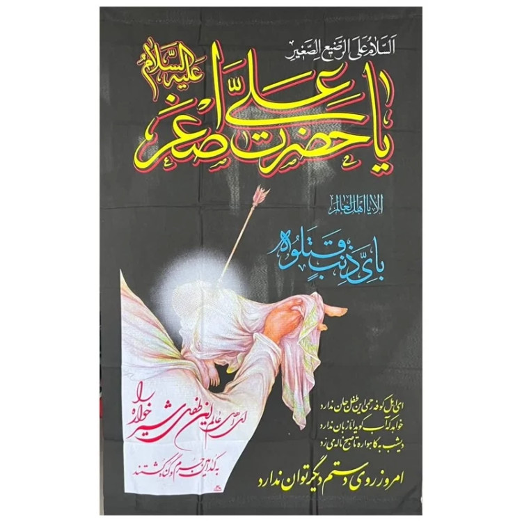 پرچم آویز طرح محرم السلام علیک یا حضرت علی اصغر علیه السلام اندازه 160 در 90 سانت بای ذنب قتلت مناسب آویز در تکایا