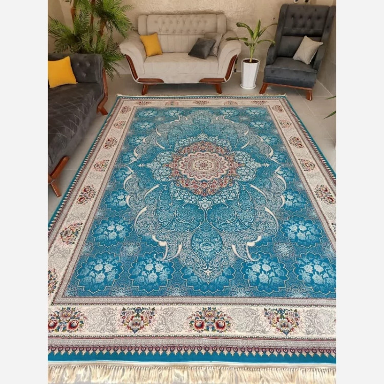 فرش چکاوک آبی فیروزه ای 9متری 700شانه تراکم 2100 نخ ورژن آبی فیروزه ای