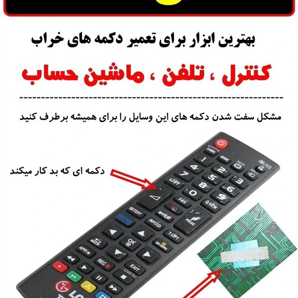 🔥خرابی دکمه های کنترل یا تلفن از مواردی است که حتما همه ما با آن مواجه شدیم ،بیشترین ایراد کنترلها خرابی لاستیک کنترل میباشد در این حالت باید دکمه های کنترل یا تلفن را آنقدر محکم فشار دهیم تا یا دستمان خسته میشود یا اعصابمان به هم میریزد علت این مشکل پاک شدن مواد کربنی چسبیده به لایه زیرین لاستیک کنترل میباشد با 15 سال تجربه در امر فروش و تعمیرات کنترل با اطمینان به شما میگویم تا به حال هیچ ابزاری که بتوان برای یکبار،وهمیشه بر این مشکل غلبه کرد وجود ندارد.اما با استفاده از طلق رسانا برای همیشه این مشکل برطرف میگردد.
