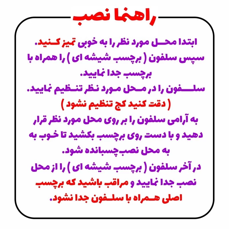 ✅رنگ سفید ابعاد 12 در 13 سانتی متر ، مقاوم در برابر آب و شستشو ، همراه با سلفون جهت نصب آسان نحوه نصب : ابتدا محل مورد نظر را به خوبی تمیز کنید سپس سلفون ( برچسب شیشه ای ) را همراه با برچسب از کاغذ جدا نمایید. سلفون را در محل مورد نظر تنظیم نمایید. ( دقت کنید کج تنظیم نشود ) به آرامی سلفون را روی بدنه ی خودرو قرار دهید و با دست و یا کارت بانکی روی برچسب بکشید تا خوب به محل نصب چسبانده شود. در آخر سلفون ( برچسب شیشه ای ) را از محل نصب جدا نمایید و مراقب باشید که برچسب اصلی همراه با سلفون جدا نشود.