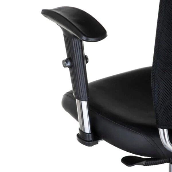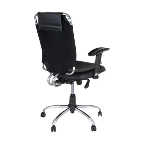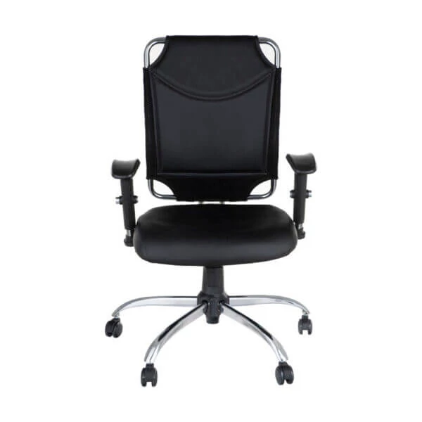 تکیهگاه: پشتی این صندلی از دو بخش توری و چرمی تشکیل شده که ضمن راحتی موجب جریان بیشتر هوا در قسمت پشت بدن نیز میشود. این ویژگی از تعرق پشت بدن در فصول گرم سال جلوگیری میکند.
