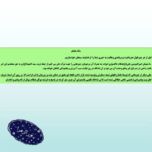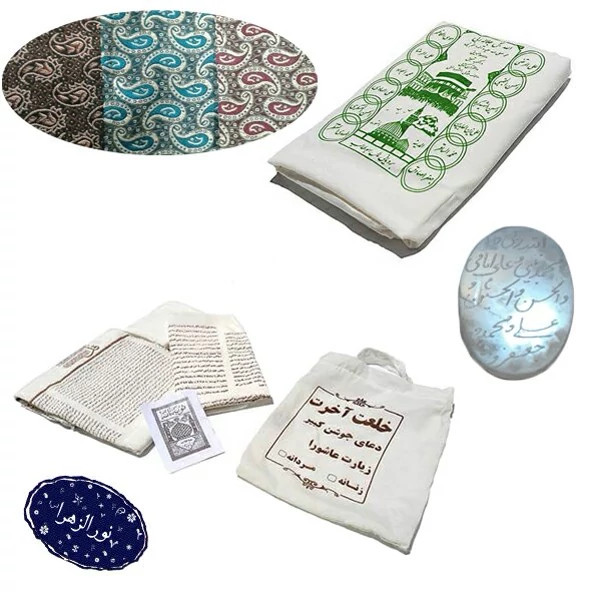 کفن: جنس پارچه معمولی.چاپ وخاک کربلا.زنانه و مردانه/خلعت آخرت بانوشته تربت کربلا،جوشن کبیر،زیارت عاشورا،14معصوم،چهارقل زنانه و مردانه