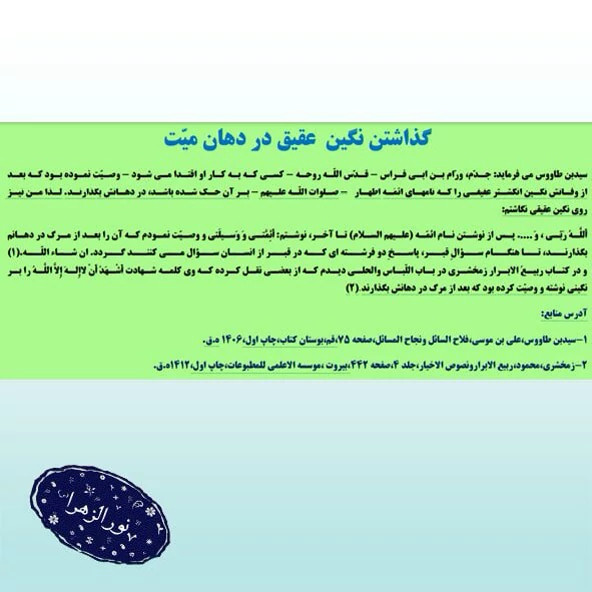 عقیق :عقیق خراسانی که روی ان ذکر و نام الله و 14معصوم را به شیوه سیدبن طاووس نوشته شده و هر عقیق با عطرمحمدی مخلوط با تربت سیدالشهدا ع معطر و متبرک شده و بعد بسته بندی می گردد. سنگ زیر زبانی میت حدودا 2.5 در 1.8 میلی متر ضخامت 3 میلی متر