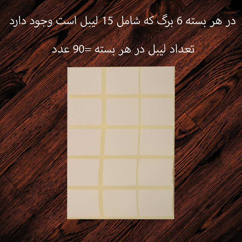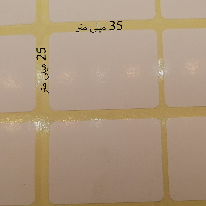 برچسب در ابعاد 25 در 35 میلیمتر که در هر برگ 15 عدد لیبل سفید بر روی زیرکار زرد روغنی تولید شده است و هر بسته شامل 6 برگ و 90 عدد لیبل در ابعاد 25 در 35 میلیمتر است.