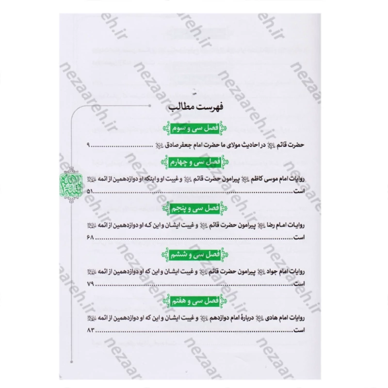 آفرینش حجت خدا قبل از آفرینش دیگر انسانها بوده است، فقط خداوند حق انتخاب خلیفه و جانشین خود را دارد، اثبات غیبت و حکمت آن، جواب های ابن قبه رازی، غیبت حضرت نوح، صالح، ابراهیم و یوسف(ع)، روایات اهل بیت(ع) درباره غیبت، کسانی که امام زمان(عج) را مشاهده کرده اند، نامههای آن حضرت، علامات ظهور، ثواب انتظار، و موضوعات فراوان دیگر.