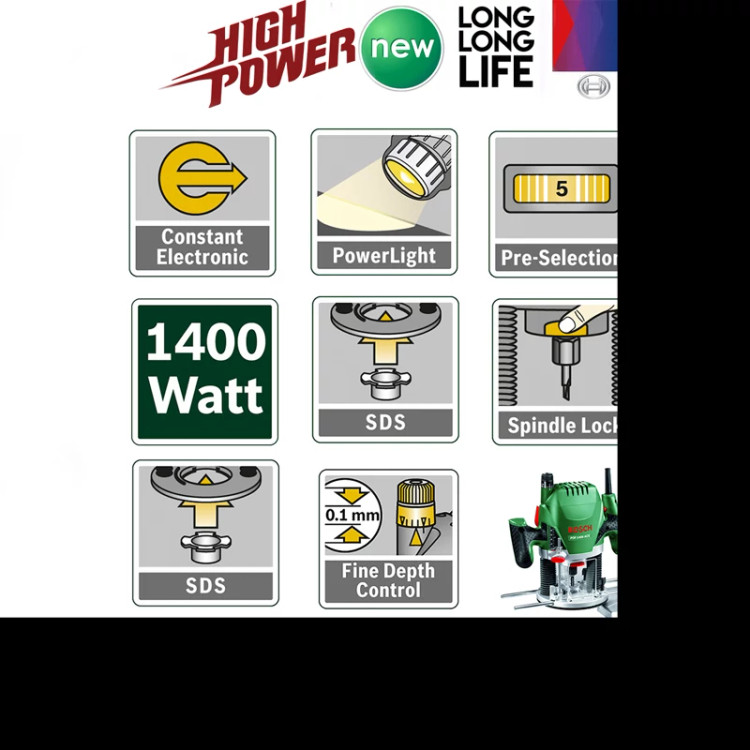 اور فرز یکی از ابزارهای پرکاربرد در صنعت چوب است. از این دستگاه میتوانید برای کارهایی مانند، برش کاری، فرم دهی، تراش، سوراخ کاری و … استفاده کنید. معمولاً از اور فرز برای ایجاد شیار یا ابزار بر روی سطح چوب و یا ابزار زدن لبههای چوب استفاده میشود. این ابزار از لوازم مورد استفاده و معمول نجارها, منبت کارها, معرق کارها و بهنوعی افرادی که با چوب و هنرهای چوبی سرو کار دارند است. یکی از کاربردهای اور فرز که بسیار مهم هست، ساخت انواع اتصالات چوب است. با استفاده از تیغههایی بسیار زیادی که تعداد آن حتی به 500 مدل مختلف هم میرسد، امکان ساخت و ایجاد طرحها، فرمها و اتصالات زیبایی دارید. در این زمینه شرکت بوش یکی از بزرگترین شرکت های دنیاست و فرز نجاری فوق با قدرت 1400 وات در این کلاس کاری یک انتخاب کاملا حرفه ایست.موتور پرقدرت با توان بالا در کاربری های سنگین موتور قدرتمند 1400 وات با Constant Electronic و Softstart برای مواد خاص مجهز به مکانیزم استارت نرم (Soft Start) جهت راه اندازی بدون شوک اولیه برخورداری از سرعت ثابت حتی در شرایط بار اضافی دارای چراغ LED جهت روشن نمودن محل کار و افزایش دید کاربر و دقت کار قابلیت تنظیم عمق برش تنظیم دقیق عمق مسیریابی در گام های 0.1 میلیمتر مجهز به قفل محور جهت تعویض آسان و ایمن صفحه برش بدون نیاز به ابزار قابلیت پاکسازی گرد و غبار و براده ها از محل برش جهت بهبود دید کاربر و دقت در برشکاری اشاره کرد . تمامی موارد کیفی و فنی این دستگاه که قطعات آن صد درصد آلمان و آمریکا میباشد و در کشور چین مونتاژ میشود موجب شده این اور فرز کاملا در نوع خود در دنیا بی رقیب باشد.