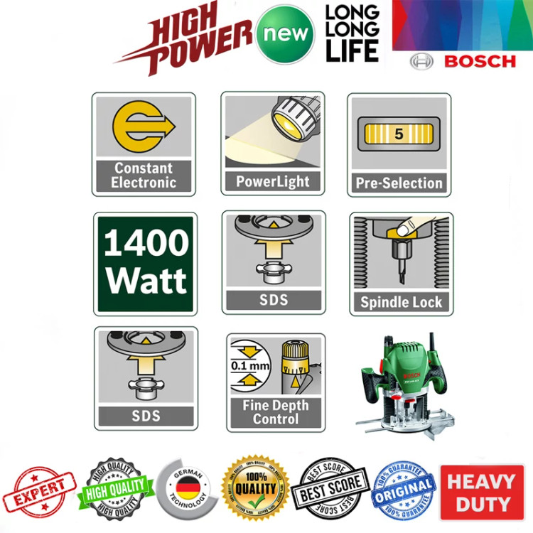 قطعات آلمان و مونتاژ چین و مجارستان / سایز کولت 6 میلی متری 8 میلی متری 1/4 اینچی / برترین فرز نجاری دنیا از نگاه کاربران سایت و فروشگاه آمازون / کسب نمره کیفی 9.9 از 10 در بین کاربران آمازون / برترین فرز نجاری دنیا به انتخاب شرکت و فروشگاه Ebay / قطعات صد در صد آلمان و آمریکا و مونتاژ چین و مجارستان / مجهز به سیستم بسیار حرفه ای restart protection / مجهز به سیستم دیمر constant speed پیشرفته بوش که باعث شده با تغییر دور و باردهی قدرت دستگاه کم نشود ( بر خلاف دستگاه های موجود در بازار که با کم کردن دور و یا بیشترین کردن بار اعمالی قدرت دستگاه پایین می آید و روی موتور فشار وارد می شود) / دارای سیستم کنترل حفاظت موتور در مقابل اضافه بار / طراحی ارگونومیک بسیار زیبا و عالی جهت کاربری آسان / سطح کلاس ایمنی 10 از 10 در نگاه آمازون / برترین فرز نجاری از لحاظ ایمنی از نگاه مؤسسه ملی ایمنی و بهداشت شغلی آمریکا (NIOSH)
