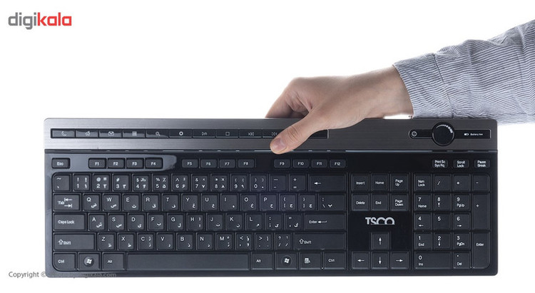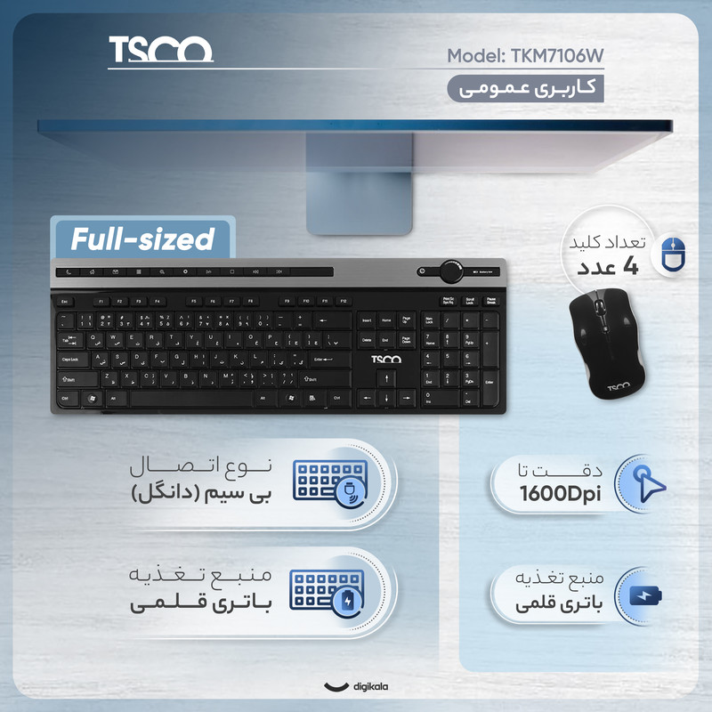 محصول «TKM7106» شرکت «تسکو» شامل یک ماوس و یک کیبورد بیسیم است. این محصول دارای طراحی خوب و ارگونومیکی با کیفیت ساخت بالاست که نیازهای خانگی و اداری را بهخوبی پاسخگو خواهد بود. کیبورد این مجموعه که از طراحی ساده و زیبایی برخوردار است، مجهز به 10 کلید میانبر مالتیمدیا و کلیدهایی با طول عمر بیش از 10 میلیون بار ضربه است. ماوس TKM7106 دارای طراحی ارگونومیک و کلیدهای روان است. حداکثر دقت حسگر این ماوس1200DPI است. ماوس این مجموعه توسط یک گیرندهی USB به کامپیوتر متصل شده و تا مسافت 10 متر برد دارد. توان مورد نیاز اقلام این مجموعه توسط دو عدد باتری سایز AAA تامین میشود. استفاده از TKM 7106 بسیار راحت بوده و نیاز به هیچگونه نصب و راهاندازی ندارد و با تمام سیستمعاملهای رایج سازگاری کامل دارد. در مجموع میتوان TKM7106 را یک مجموعهی مناسب و مقرونبهصرفه برای مصارف خانگی و اداری دانست.