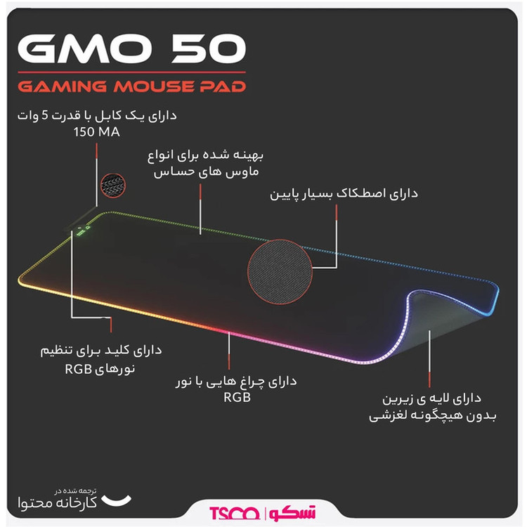 دارای 12 حالت تغییر نور استفاده از پارچه ترکیبی برای سرعت و کنترل بهتر ماوس دارای سطح ضد لغزش طول کابل : 1.5 متر دارای کلید تغییر وضعیت نور و حالت RGB 12 حالت تغییر نور