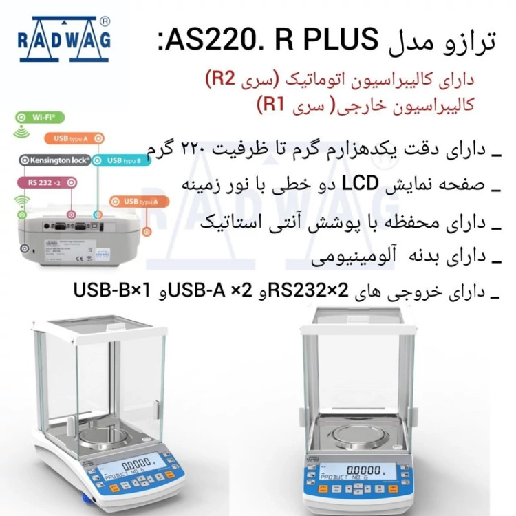 ترازو Radwag مدل AS 220.R2 وR1 PLUS یک ترازوی آزمایشگاهی با دقت 4 رقم اعشار است که از ویژگیهای اصلی آن میتوان به موارد زیر اشاره کرد: