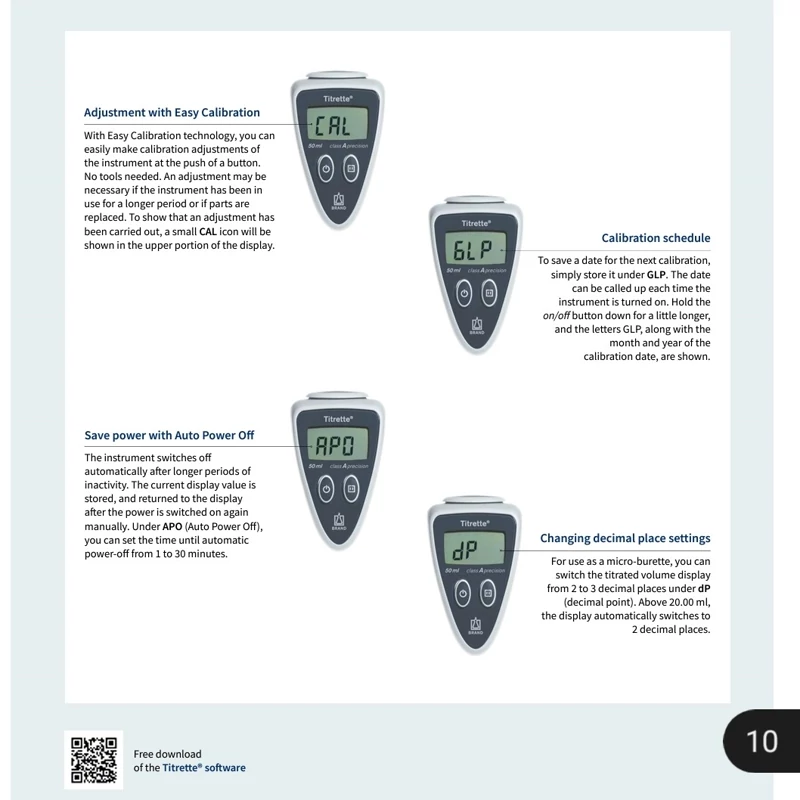 در منوی دستگاه برنامه ای جهت کالیبراسیون سیستم طراحی شده است که در صورت نیاز کاربران می توانند با انجام تست های گراویمتری و کنترل کیفی اقدام به کالیبره نمودن دقیق بورت نمایند. در ضمن امکان تغییر 14 اعشار دستگاه در برنامه وجود دارد که به این ترتیب Titrette تنها بورت دیجیتال با امکان کار حتی با رزولوشن 0.001ml خواهد بود.