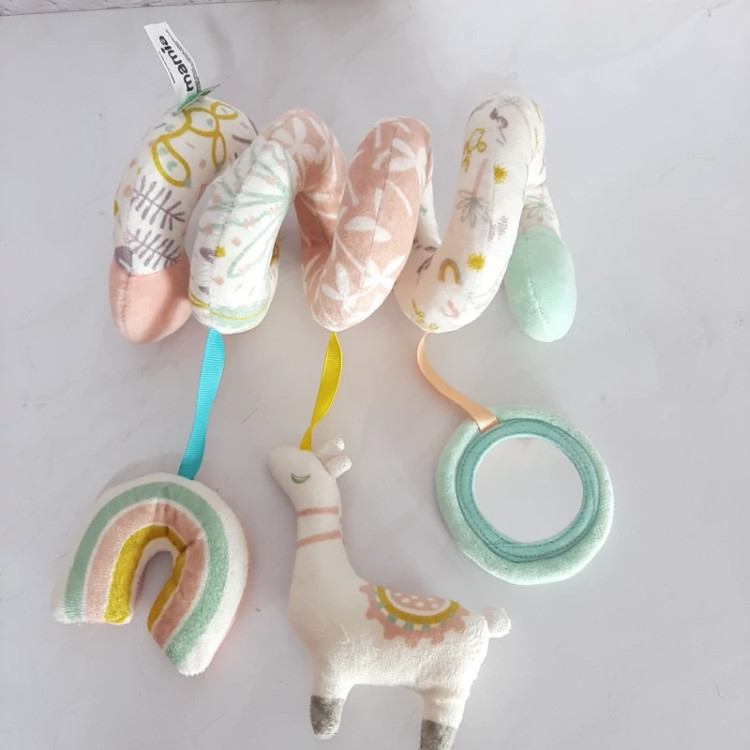 آویز و دورپیچ تخت بسیار زیبا و باکیفیت از برند ماماپاز،خیلی شیک و با کیفیته. رنگ های عالی ، دارای جغجغه آئینه و بوق بوقی قابل شستشو