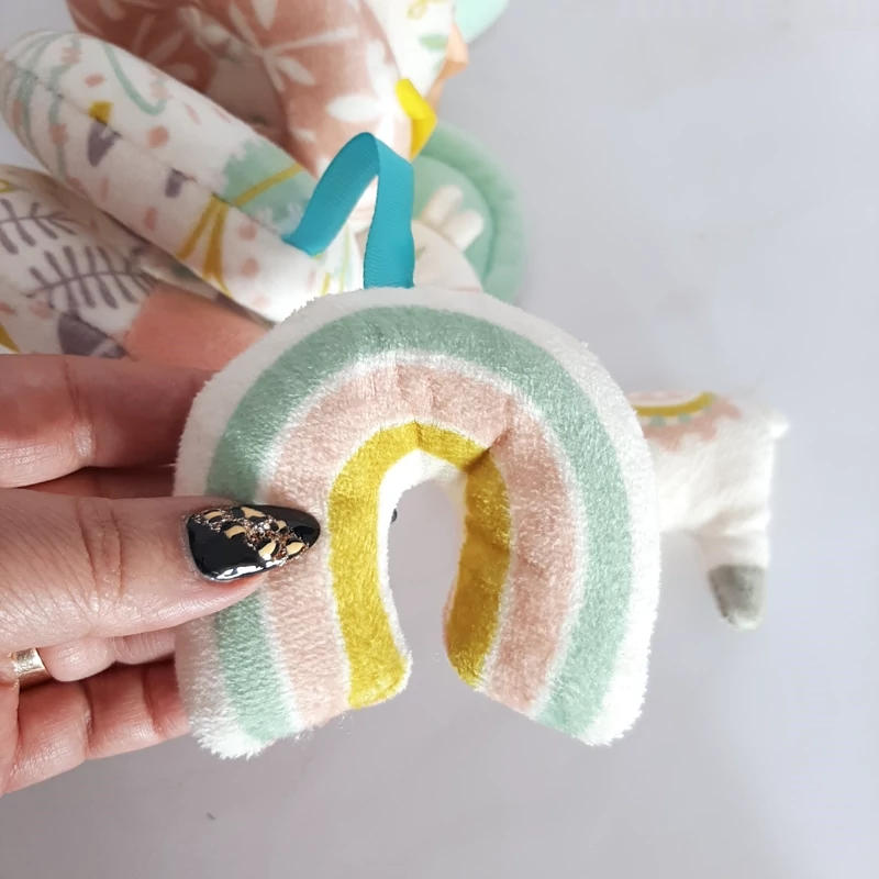آویز و دورپیچ تخت بسیار زیبا و باکیفیت از برند ماماپاز،خیلی شیک و با کیفیته. رنگ های عالی ، دارای جغجغه آئینه و بوق بوقی قابل شستشو
