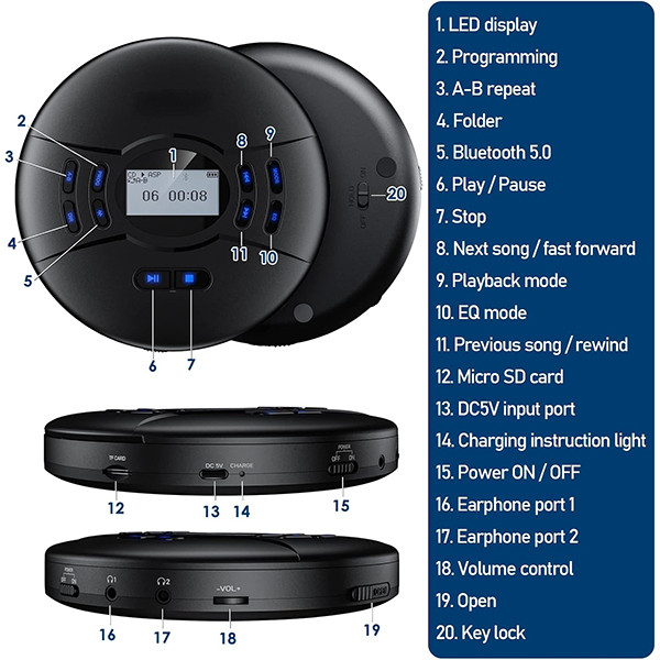 سایر ویژگیها: اطلاعات فنی: برند Gueray مدل محصول G-2101 ASIN B09FY81L26 فناوری اتصال بلوتوث، کمکی ویژگی های ویژه قابل حمل ابعاد بسته 8.9x6.77x1.85 اینچ اقلام همراه: دستگاه پخش سی دی کابل کمکی کابل USB هدفون کیف پارچه ای کتابچه راهنمای کاربر