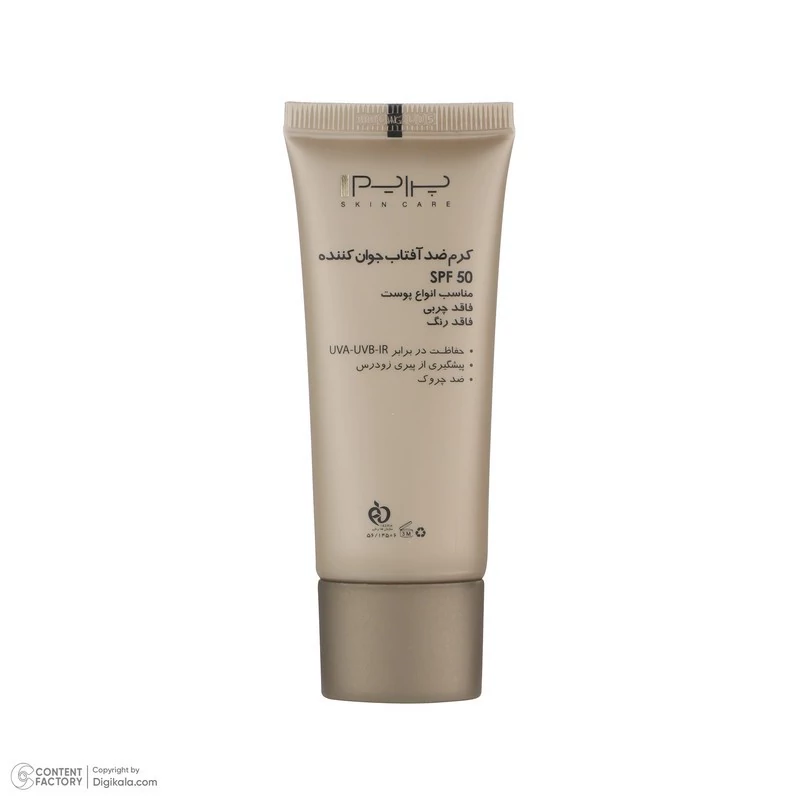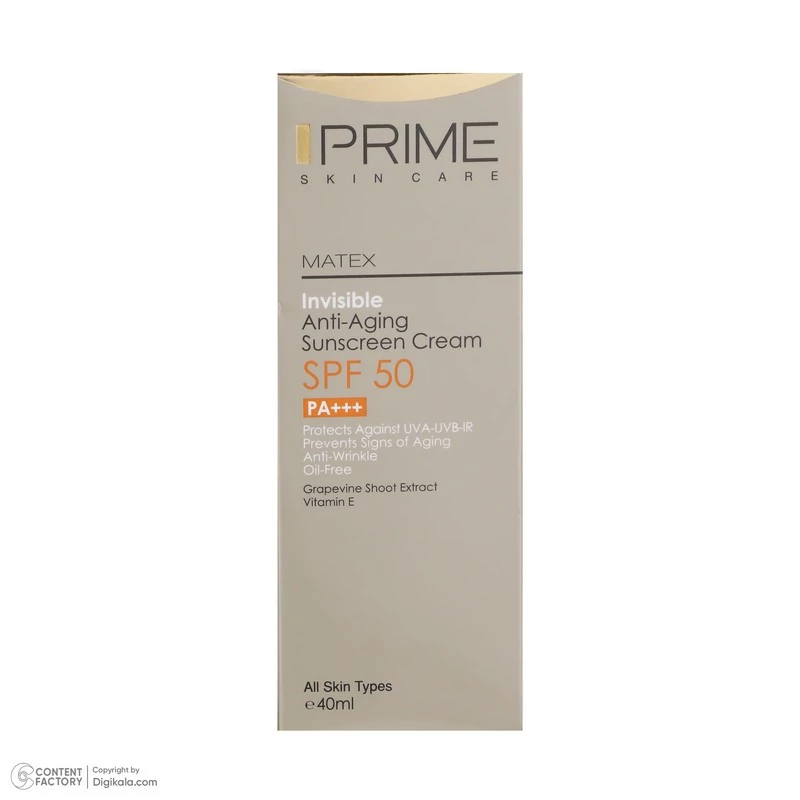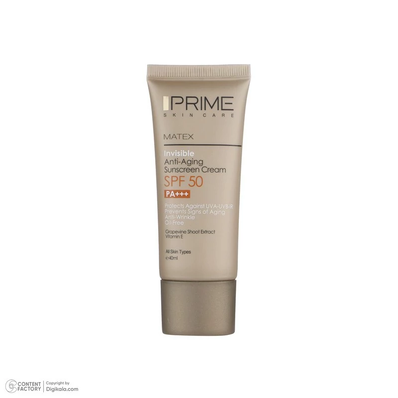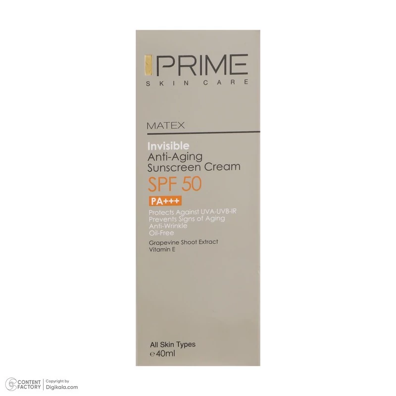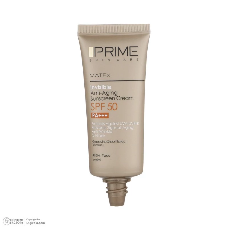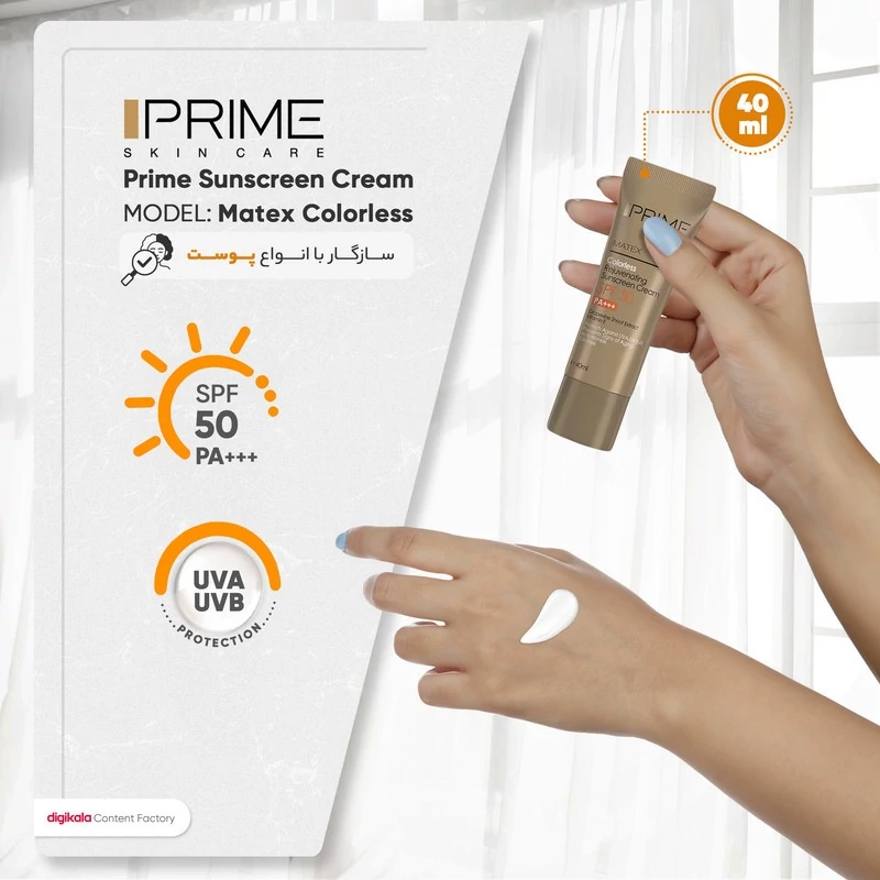 کرم ضد آفتاب بدون رنگ SPF50 یکی از محصولات کارخانه پرایم است که به عنوان محصولی ایرانی با کیفیت بالا رقیبی جدی برای همتایان خارجی خود به شمار میرود. این محصول محافظی قوی برای پوست در برابر اشعه های UVA، UVB، IR به شمار میرود. این محصول که در ساخت آن از عصاره ساقه انگور استفاده شده فاقد چربی است و میتواند انواع لک و جای جوش را بپوشاند. بهترین روش مصرف برای این کرم ضدآفتاب پوشاندن پوست با مقدار کافی از کرم 20 دقیقه قبل از قرار گرفتن در معرض نور آفتاب است. برای بهترین نتیجه بهتر از مصرف کنندهی این کرم هر 2 ساعت یک بار یک لایه جدید از کرم روی پوست خود بکشد. همچنین در مواردی مانند تعریق شدید، شنا و یا در ساعاتی از روز که تابش نور شدیدتر است میتوان ضدآفتاب را در فواصل زمانی کوتاهتر تجدید کرد. مدت انقضای این محصول که به صورت یک تیوپ ارائه شده است از طرف شرکت سازنده 36 ماه از زمان ساخت اعلام شده و حجم بطری آن 40 میلیلیتر است. این محصول که ویژهی صورت در نظر گرفته شده برای پوست آقایان و خانمها ساخته شده است. بنابر این محدودیتی در جنسیت مصرف کننده و ندارد و برای تمامی سنین نیز مناسب است. یکی از توصیههایی که پیش از مصرف لوازم آرایشی و خصوصا کرم ذکر میشود، تست حساسیت است تا از عدم بروز حساسیت در برابر مواد موجود در کرم اطمینان حاصل گردد.