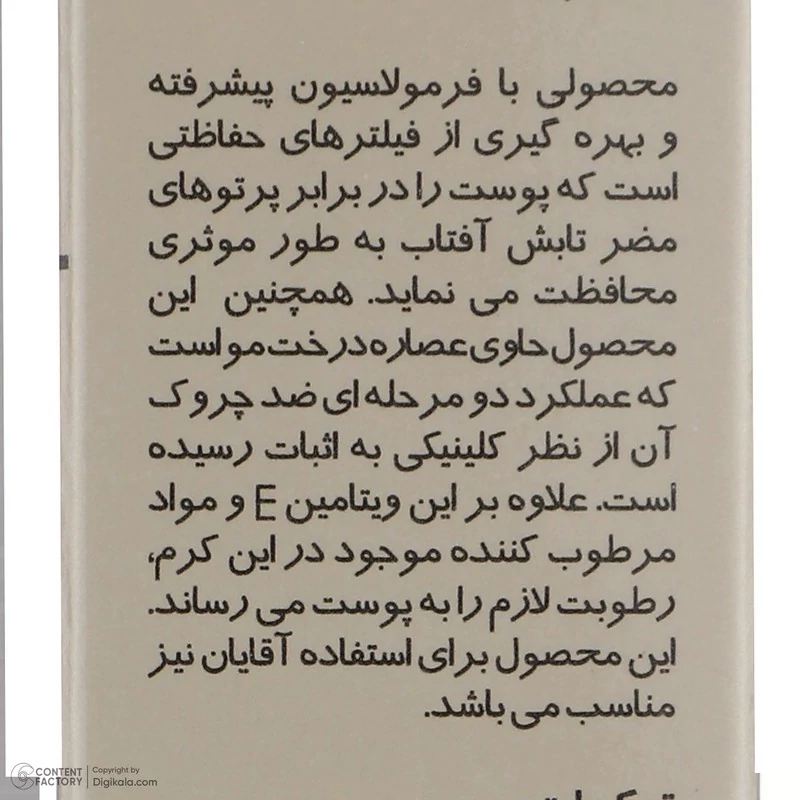 مشخصات-راهنمای استفاده: بیست دقیقه قبل از قرار گرفتن در معرض آفتاب، نواحی از پوست خود را که در تماس با نور آفتاب است، با مقدار کافی از کرم بپوشانید. هر 2 ساعت یک بار کرم را تجدید نمایید. همچنین در مواردی مانند تعریق شدید، شنا و یا در ساعاتی از روز که تابش نور شدیدتر است ضد آفتاب را تجدید نمایید.
