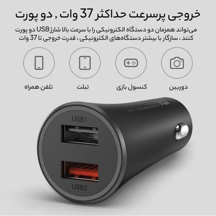 شارژر فندکی شیاومی مدل Mi 37w dual-port car charger دارای دو خروجی USB با توان شارژ دهی 37w می باشد که قابلیت شارژ کردن انواع گوشی تلفن همراه که دارای تکنولوژی شارژ سریع را می باشند را دارد . جنس بدنه فلزی و کیفیت ساخت بالایی برخوردار می باشد . Mi 37w dual-port محدودیتی در شارژ کردن دستگاه های تلفن همراه و یا تبلت برای این دستگاه وجود ندارد .