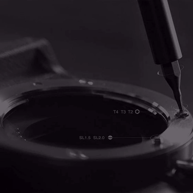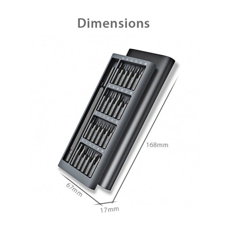 این محصول یک دستهی پیچگوشتی 12.5 سانتیمتری دارد که در عین ظرافت در تولید و طراحی از دوام و مقاومت بسیار خوبی نیز برخوردار است. این دسته از روکش ضد زنگ بهره میبرد و برای کارهای مختلفی از جمله تعمیرات عینک، محصولات الکترونیکی، اسباببازی، تلفن، لپتاپ، موبایل و غیره مورد استفاده قرار میگیرد. سریهای پیچ گوشتی این محصول از آلیاژ آلومینیوم ساخته شده و دارای حالت مغناطیسی است تا پیچهای کوچک را جذب کرده و از گم شدن آنها جلوگیری کند. دستهی پیچگوشتی این مجموعه نیز از آلیاژ آلومینیوم ساخته شده و در تولید آن از فناوری اکسیداسیون آنودایز استفاده شده تا دوام و مقاومت بسیار خوبی در برابر ضربه و خوردگی داشته باشد.