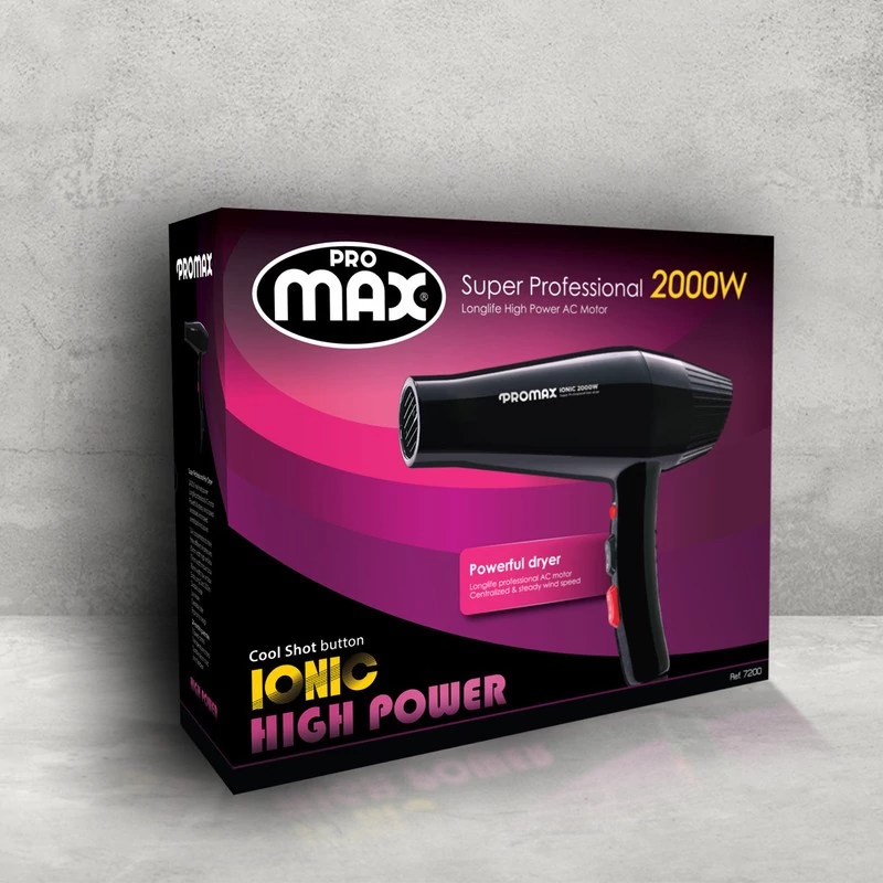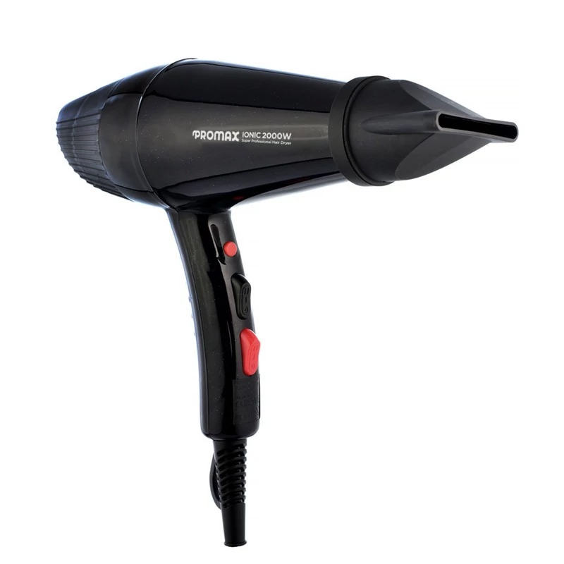 سشوار پرومکس مدل 7200 سشواری حرفهای دارای موتور 2000 وات AC ، دکمهی فناوری تولید یون و سه متمرکز کنندهی هوا است.