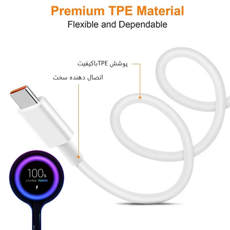 این یک کابل شارژ بسیار باکیفیت است که ظرفیت لازم برای عبور جریان تا گوشی های سوپر فست 67 وات را داراست.علاو بر سرعت بالای شارژر شدن گوشی قابلیت دیتای بسیار خوبی نیز دارد و از این کابل می توانید برای تبادل اطلاعات نیز استفاده نمایید.طول این کابل حدودا یک متر است و جنس بدنه بسیار محکمی دارد که در مقابل پارگی و پیچش مقاوم است. همچنین از این کابل میتوانید برای همه گوشی های فست و سوپر فست نیز استفاده نمایید.