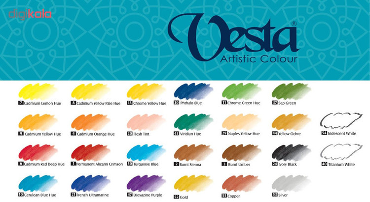 رنگ قهوهای مایل به زرد سوخته دارای سایههای درخشان با خشکی و پایداری بالا نفوذپذیری عالی هوا در رنگ قدرت چسبندگی فوقالعاده مقاومت خوب در برابر آب امکان مخلوط شدن با سایر رنگهای اکریلیک وستا و همچنین سایر مکملهای نقاشی اکریلیک ساخت ایران