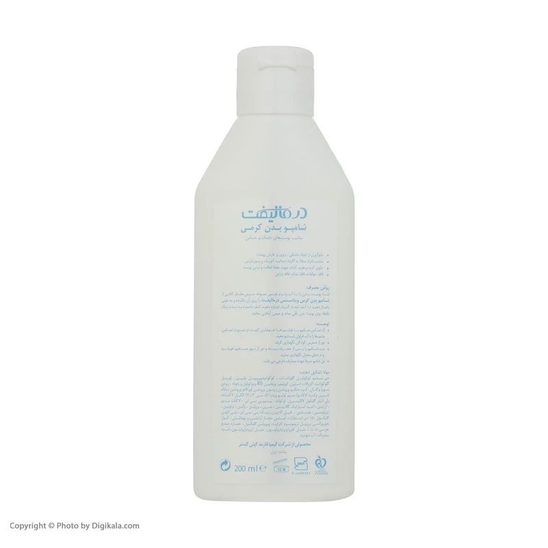 مشخصات-راهنمای استفاده: ابتدا پوست بدن را با اب ولرم خیس نموده ، سپس مقدار کافی از شامپو بدن کرمی درمالیفت را روی آن مالیده و به خوبی ماساژ دهید تا کف ایجاد گردد .