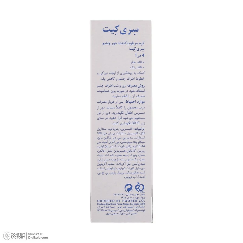 کرم مرطوب کننده دور چشم 4 در 1 سری کیت با داشتن ترکیبات موثر و با خاصیت ضد چروک و مرطوب کنندگی قوی به تامین رطوبت مورد نیاز پوست دور چشم میپردازد. این محصول برای تمامی افراد با انواع پوست حتی پوستهای حساس مناسب است. کرم 4 در 1 سری کیت خشکی و عوارض ناشی از آن را از بین میبرد و با افزایش گردش خون مویرگی، تیرگی و پف زیر چشم را از بین خواهد برد.