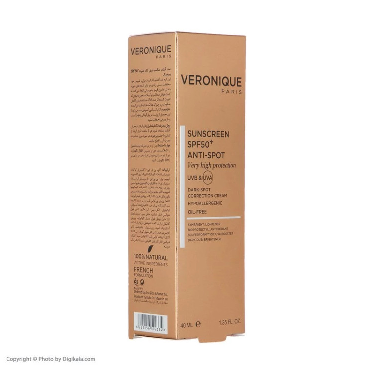 کرم ضد آفتاب ضد لک VERONIQUE دارای حجم 40 میلی لیتر میباشد. این کرم ضدآفتاب با ترکیبات موثر و طبیعی منجر به محافظت بسیار قوی در برابر اشعههای ماوراء بنفش و مادون قرمز میشود و به کاهش لکها کمک شایانی میکند. کرم ضدآفتاب ورونیک مدل ضدلک مناسب استفاده انواع پوست و فاقد چربی میباشد. محصولات ورونیک تولید ایران با فرمولاسیون فرانسه میباشند. کرم بواسطه دارا بودن ویتامین C دارای خاصیت آنتی اکسیدانی میباشد.